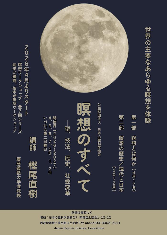 瞑想的経験の諸相」(2024年度)では、瞑想の諸類型を中心に説明し、瞑想の理論と歴史について扱った。「瞑想の技法」(2025年度)では、坐法・ムドラー・丹田・背骨を主題として、瞑想実践における見える肉体の使い方を通した不可視の身体の起動と活性化について扱った。2026年度では、過去2回の瞑想論シリーズを止揚し、「瞑想のすべて」と題して、十全な過不足ない瞑想論を展開する。かつこれまで深く扱って来なかった瞑想が実現する「悟り」の内実について、そして、瞑想の起源であるダンス、瞑想日本の「道」の実践、および動的瞑想と現代における瞑想の想像的創造と社会変革の可能性についても講義する。